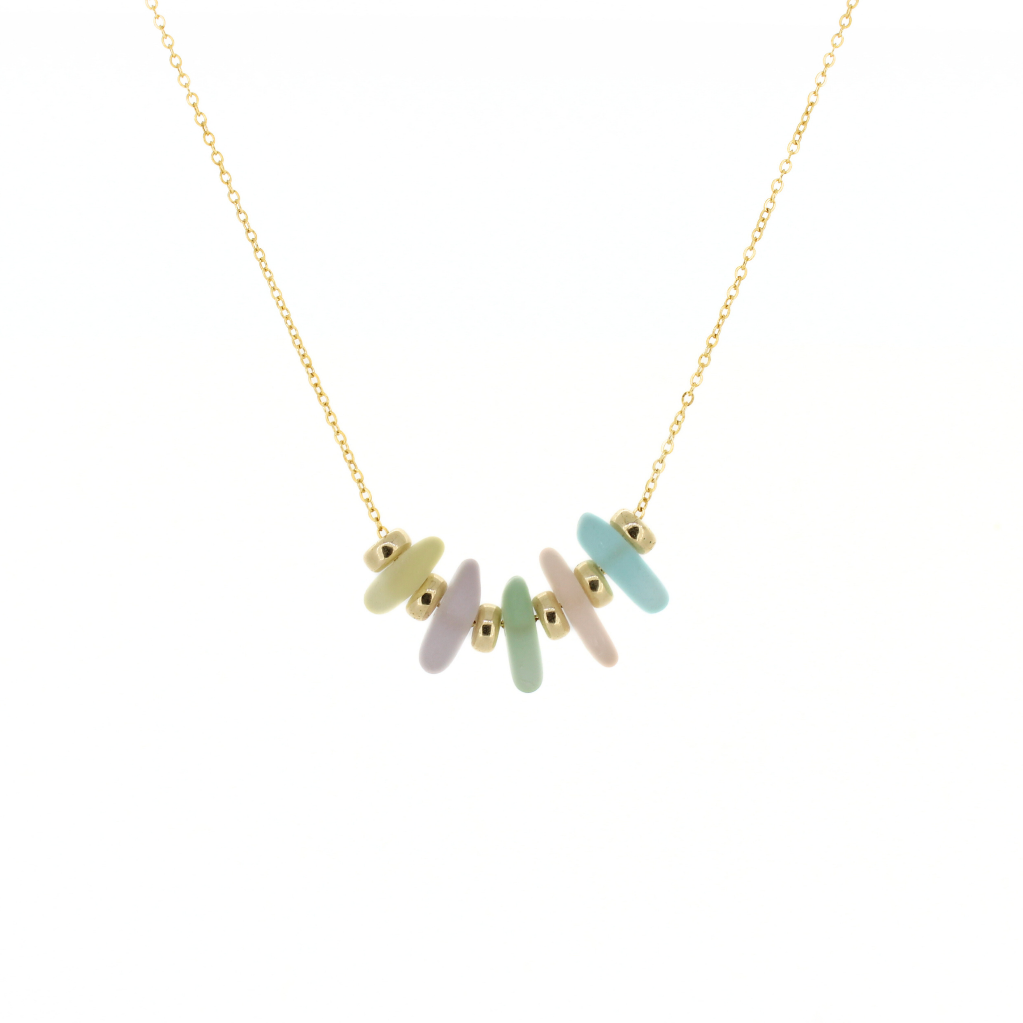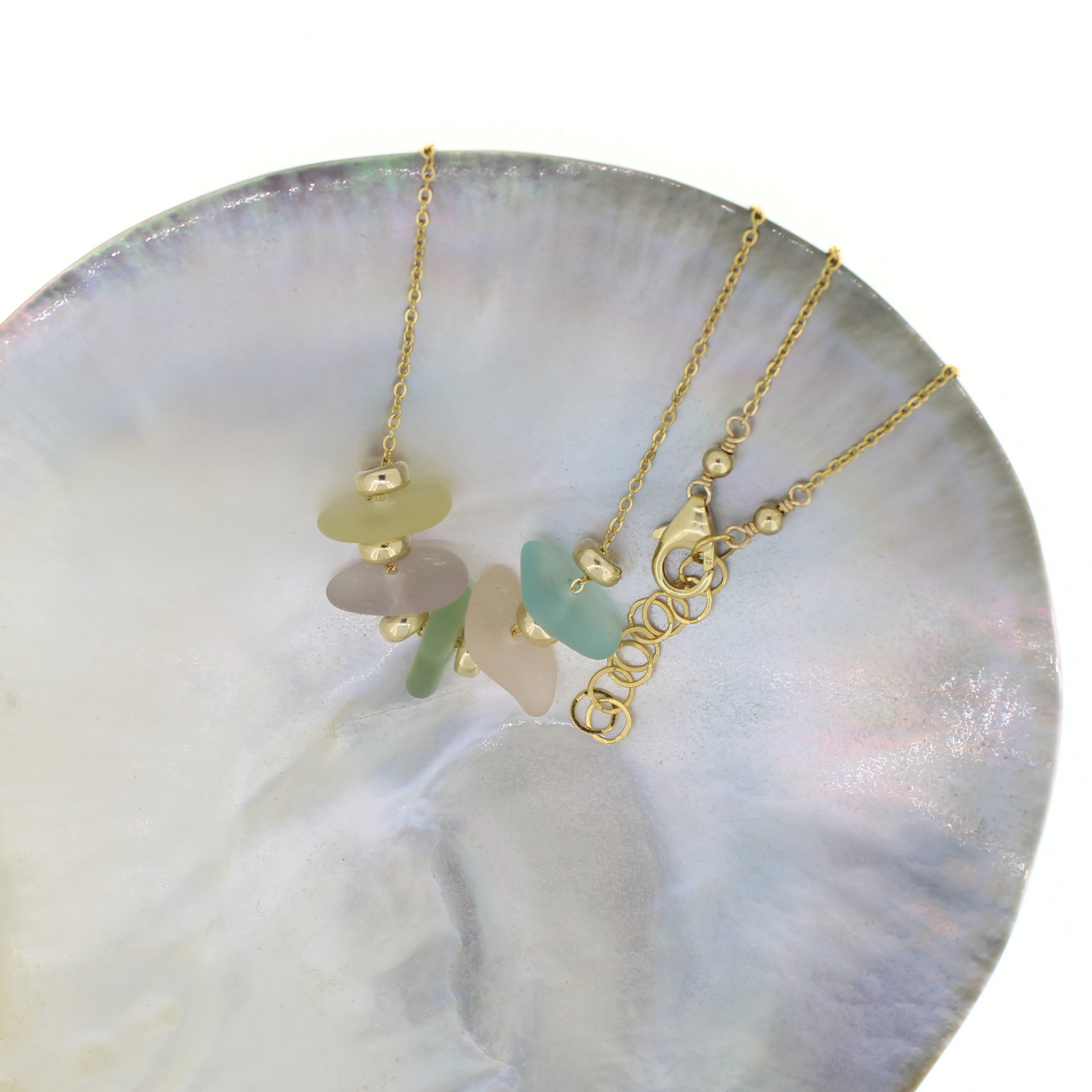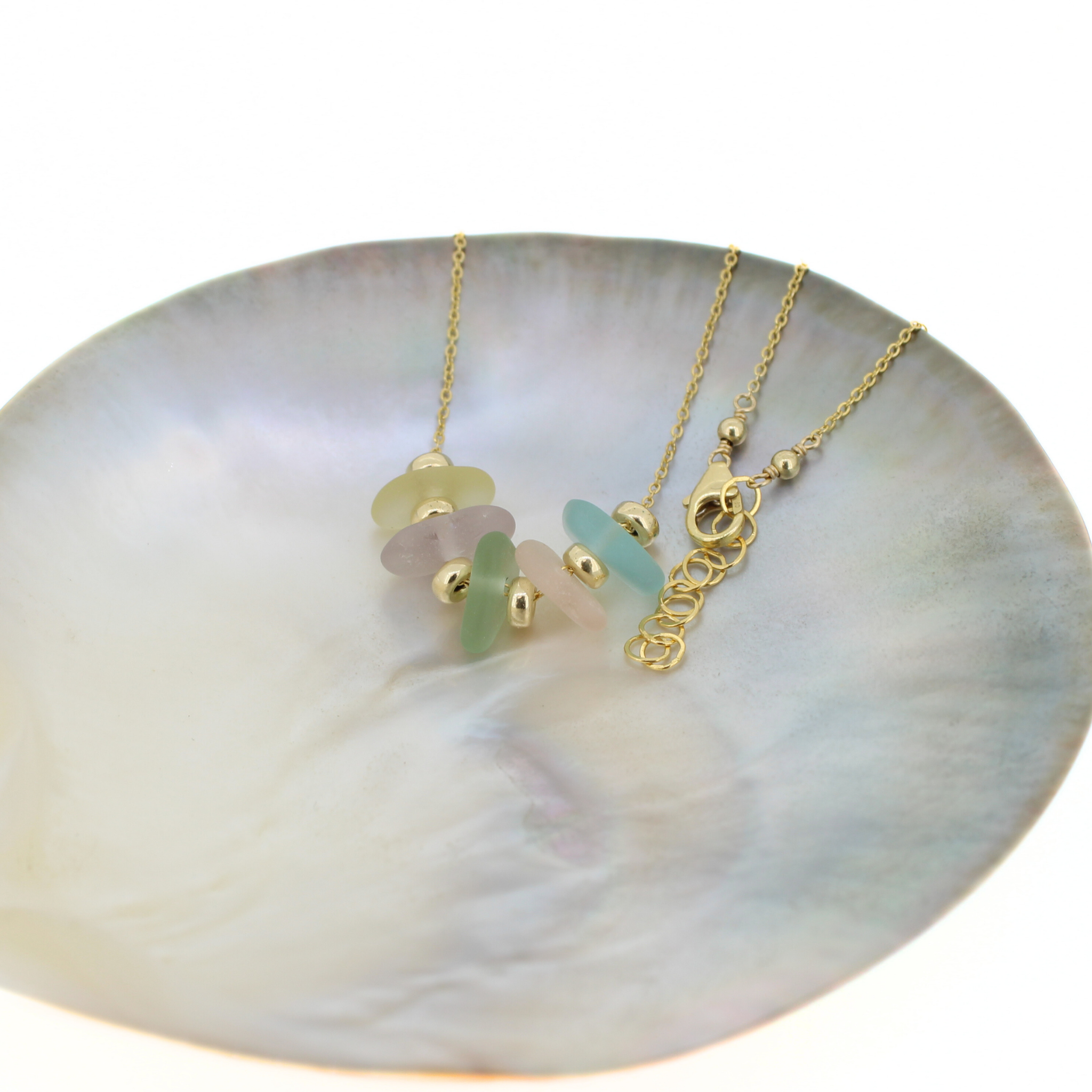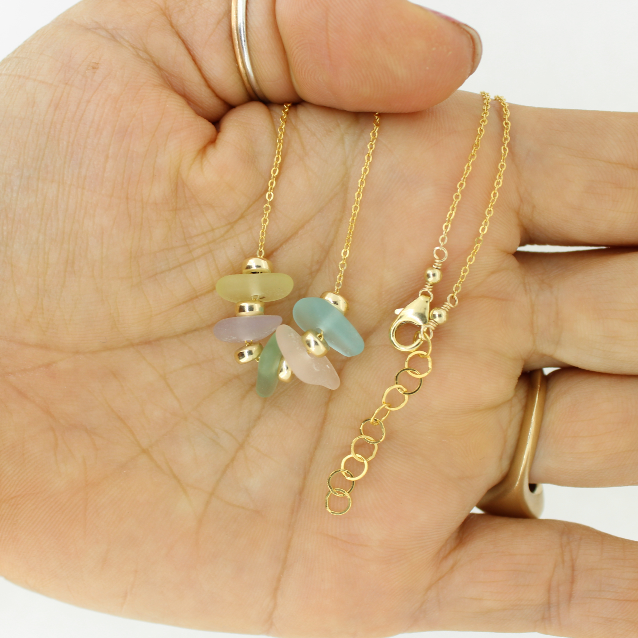 This joyful necklace features a mix of rare, genuine sea glass in soft rainbow hues—ranging from soft purple to light blue, sea foam green and sunshine yellow. Floating between warm gold accents on a delicate 14k gold fill chain, these naturally frosted pieces feel like tiny coastal miracles.