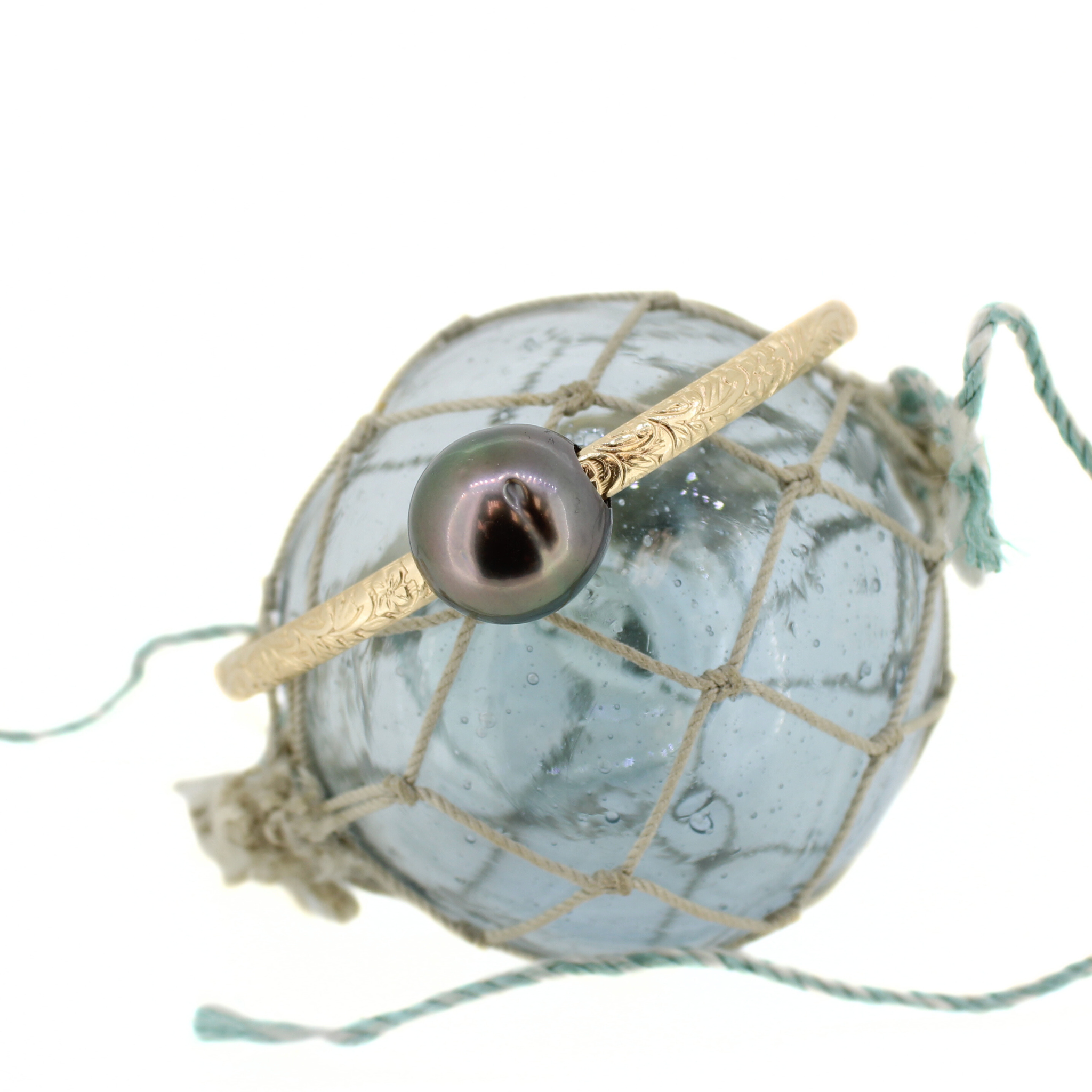 The bangle has a floral design that resembles the traditional Hawaiian heirloom style jewelry. The band is approximately 4.1mm wide. This large pearl has a subtle peacock overtones, a shiny luster and a few minor imperfections. The pearl measures approximately 14.8mm large.