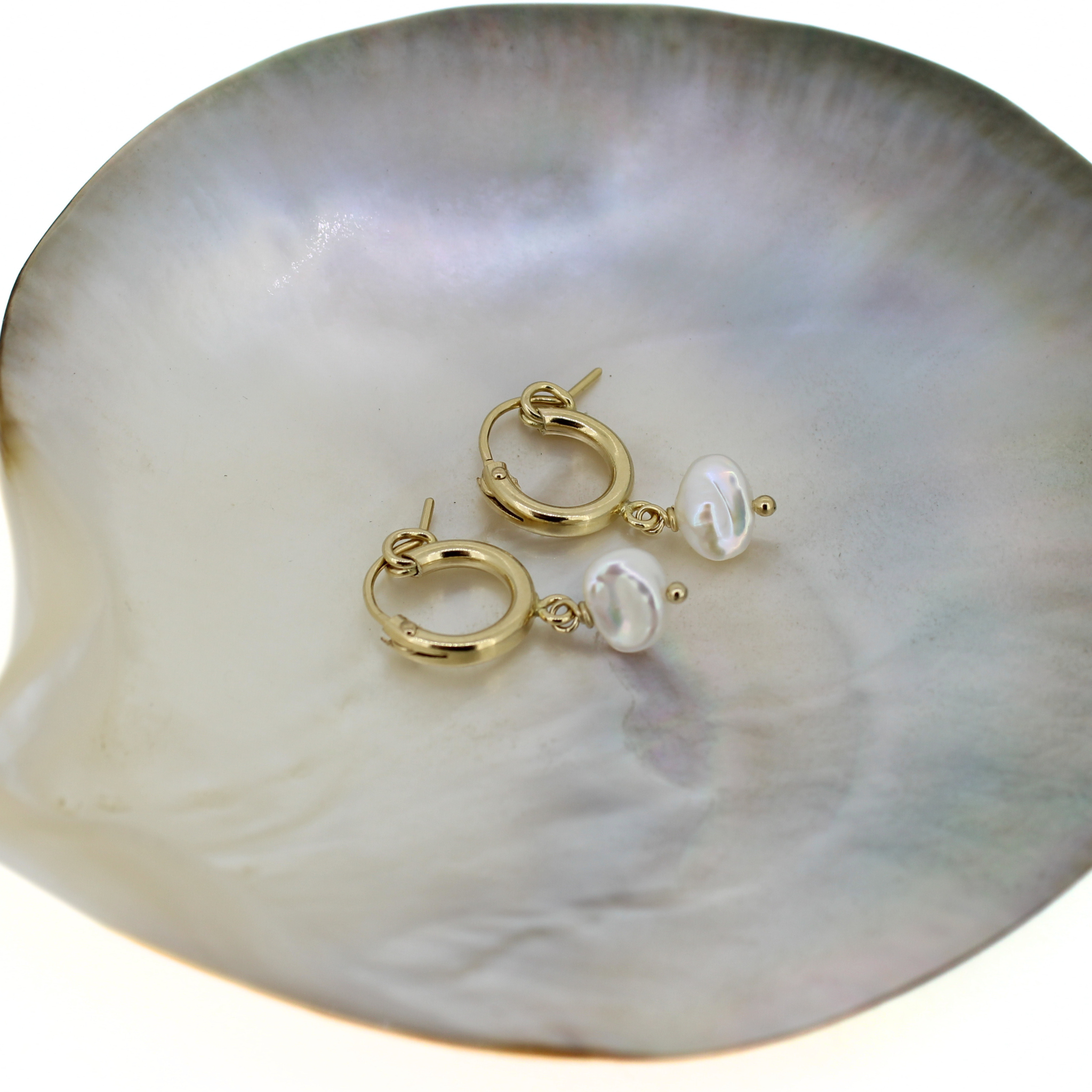 Beautiful little Edison keshi pearls hang from our sweet and simple 14k gold filled hoops.