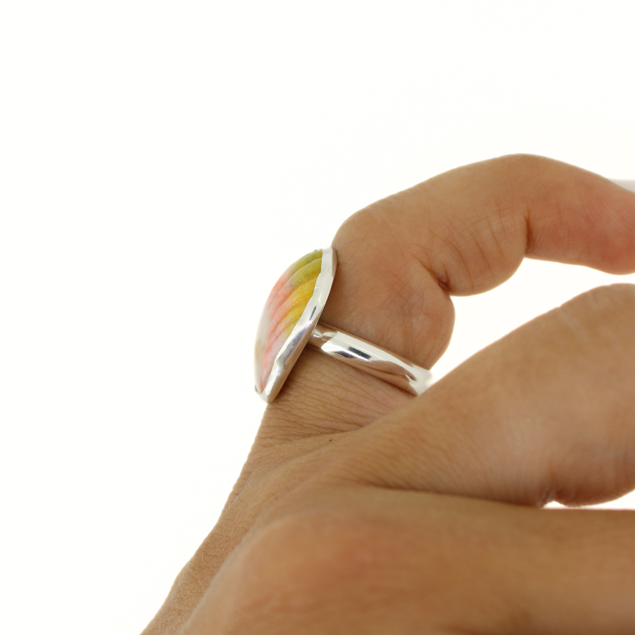 This ethically-sourced Hawaiian sunrise shell is carefully bezel set in sterling silver, creating a stunning and unique ring. This ring brings a touch of the tropics to any outfit.