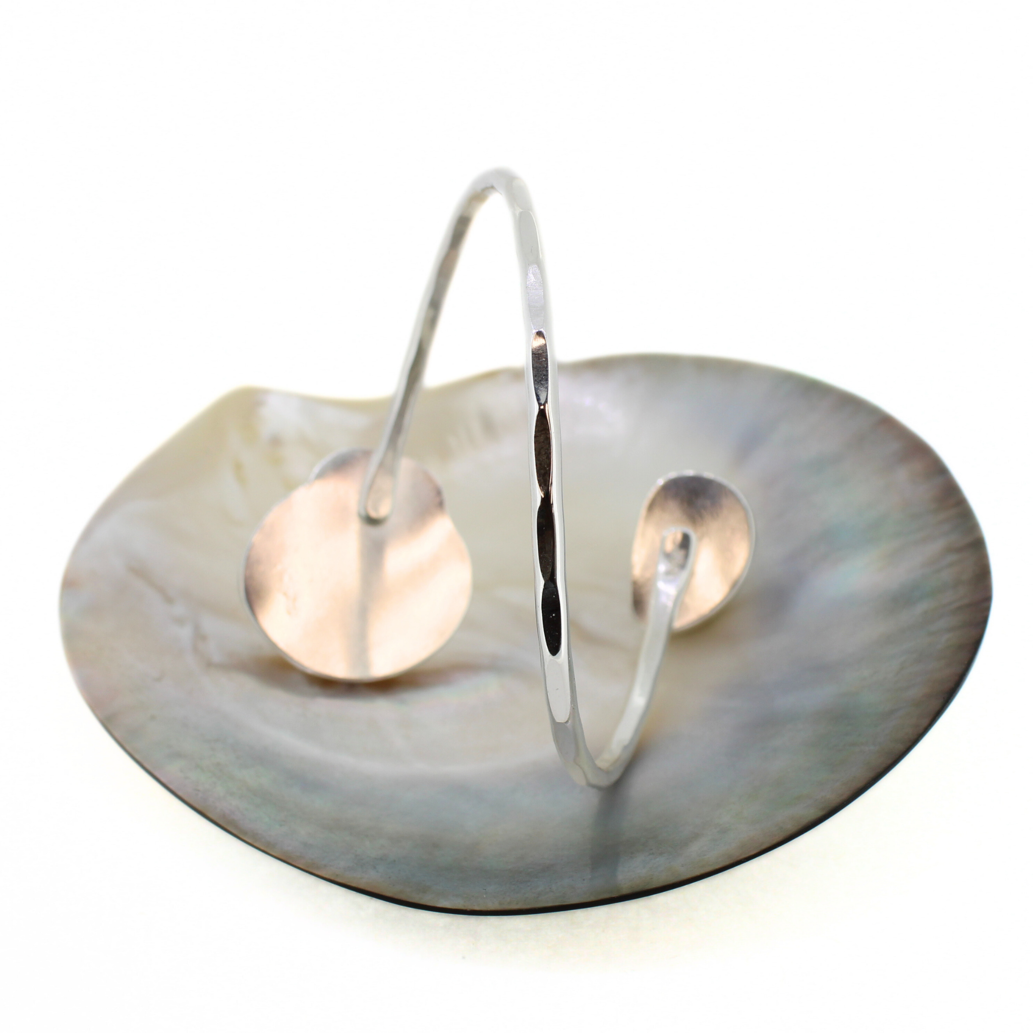 This cuff is a size small. It is slightly adjustable, but will fit best on wrists that measure 6.5" and smaller. The sturdy cuff band has a clean hammered texture.