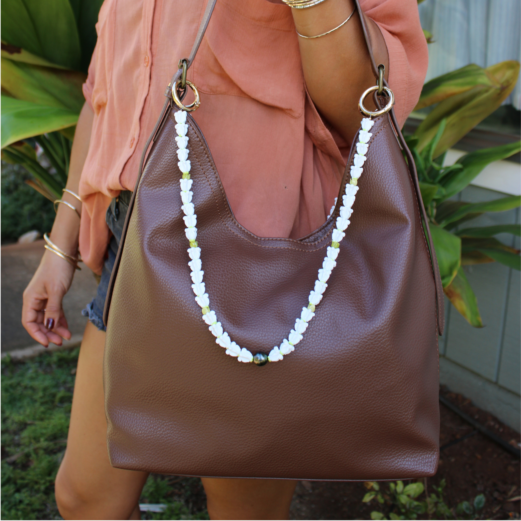 White Crown Flower & Pakalana Long Purse Lei with Tahitian Pearl
